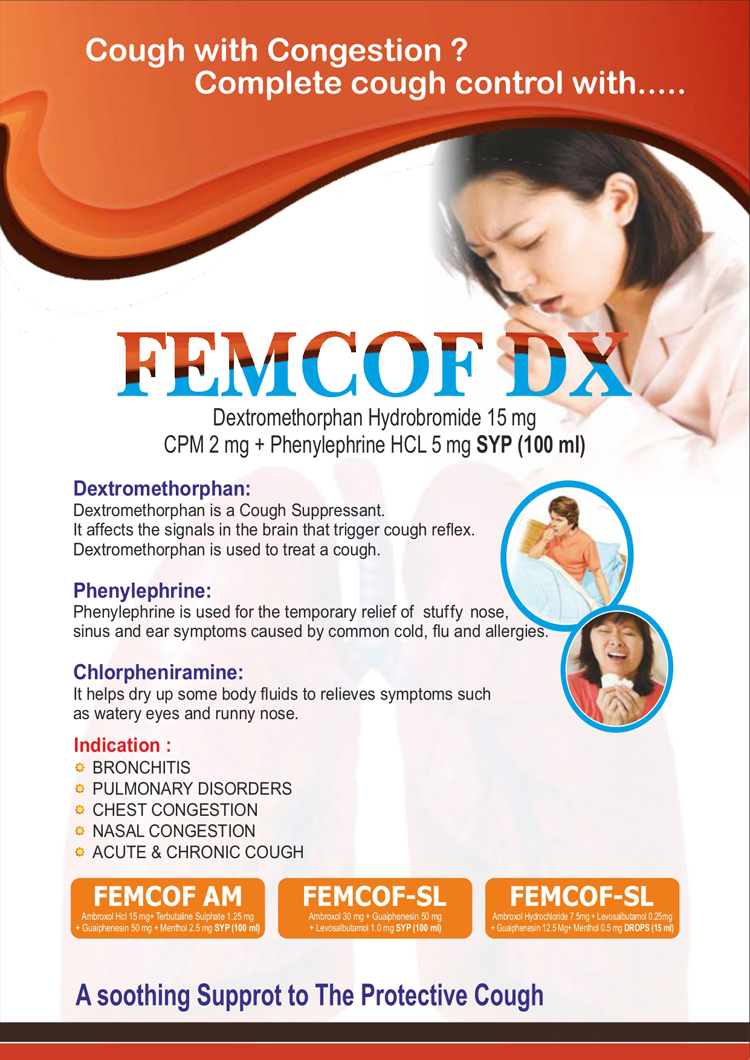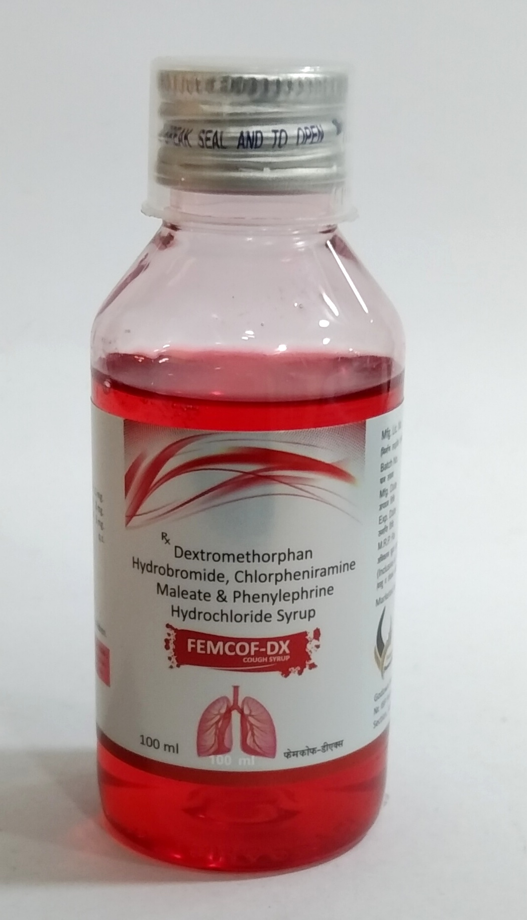 67 FEMCOF DX SYRUP DEXTROMETHORPHAN HYDROBROMIDE 15MG WITH CHLORPHENIRAMIN MALEATE 2MG WITH PHENYLEPHRINE HCL 5MG SYRUP 100 ML View.. View..