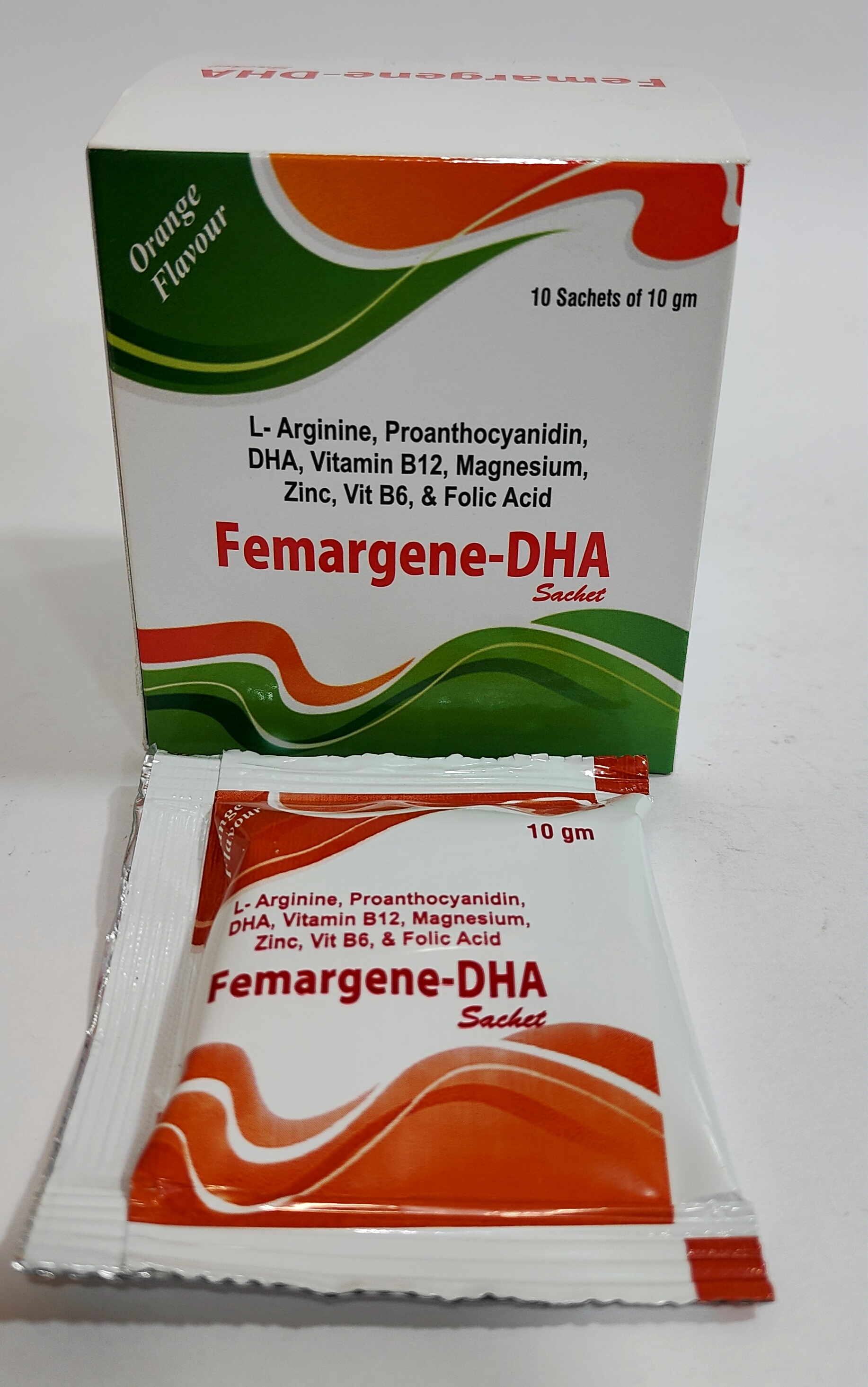 155 | FEMARGENE – DHA SACHET | L-ARGININE 3 GM WITH PROANTHOCYANIDINE 75 MG WITH DHA 200 MG WITH METHYLCOBALAMIN 1500 MCG WITH MEGNESIUM 100 MG & ZINC 10 MG WITH VIT. B6 3 MG WITH FOLIC ACID 1.5 MG |
